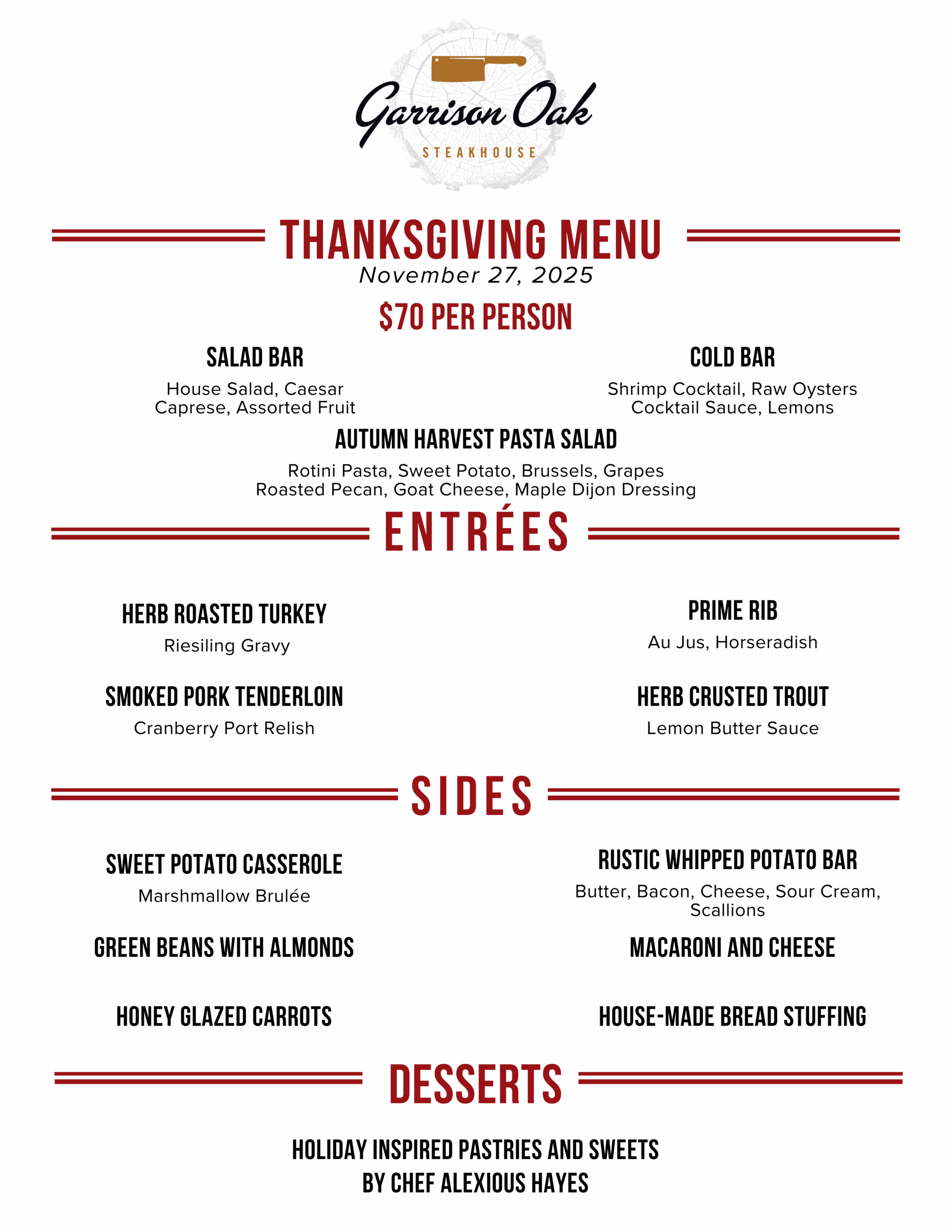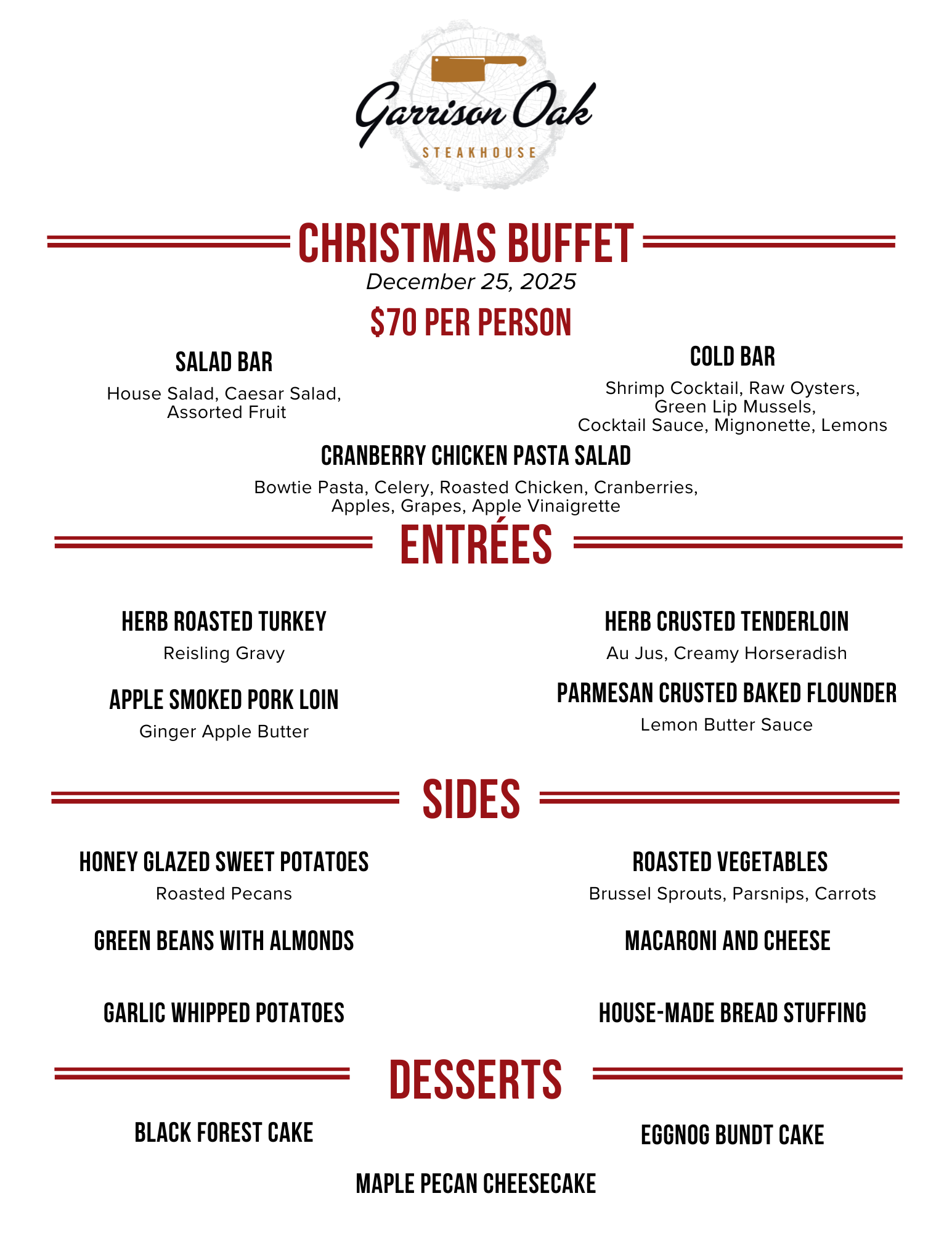 Garrison Oak Steakhouse’s all-star culinary team has sourced the finest beef, pork, chicken, and cold-water seafood and brought them right here to Oak Grove for your enjoyment. Our menu features a selection of USDA Certified cuts of beef, including a mouth-wowtering 16 oz. Porterhouse and New York Strip. Plus, we offer a variety of flavorful starters, sides and chef’s specialties like the Butcher’s Block Burger, Chilean Sea Bass and Double Bone-In Porkchop.