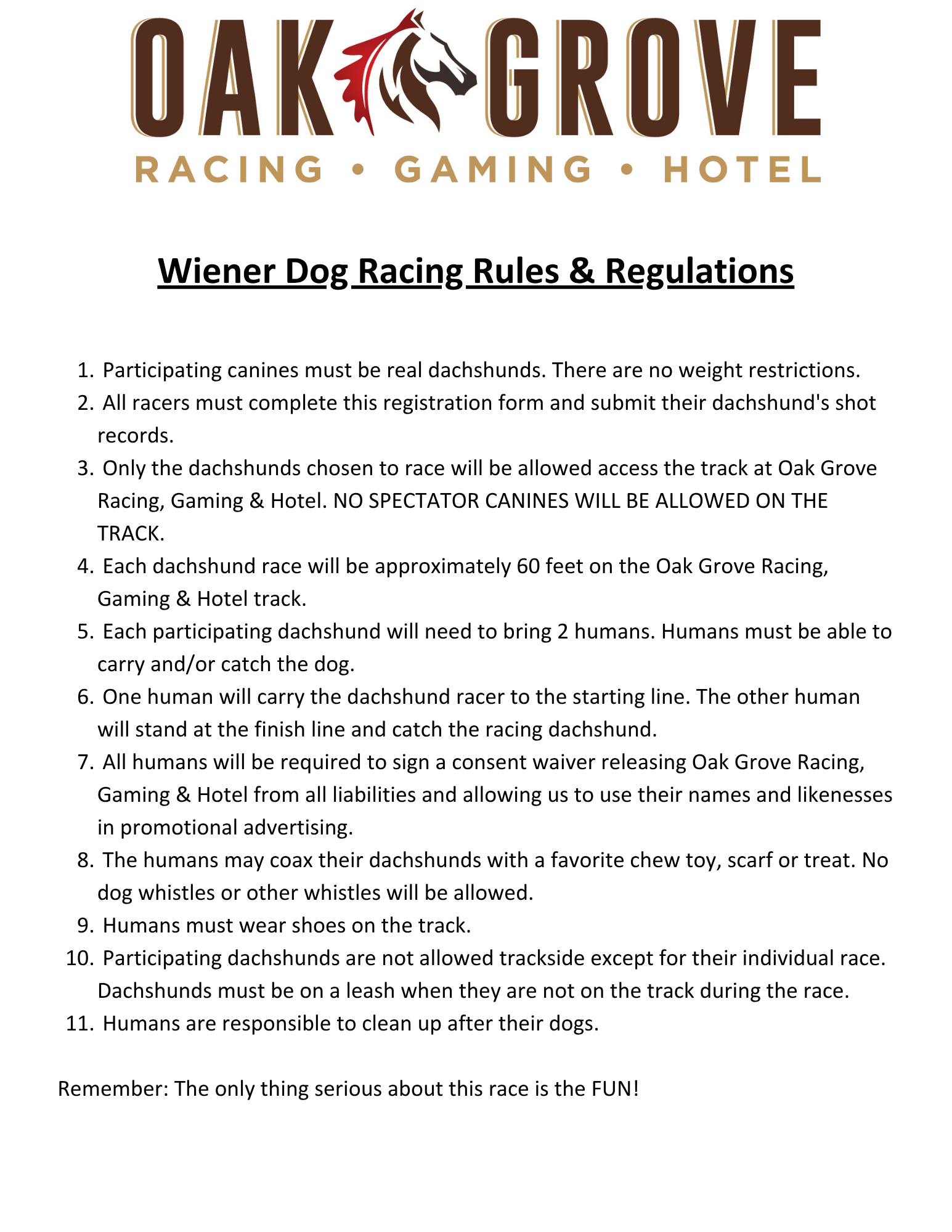 Join us for our charity Wiener Dog Races on Monday, May 25th! Come see our regularly scheduled live harness racing along with charity Wiener Dog Races! It’s sure to be a barking good time! Wiener Dog Races will occur in between the regularly scheduled harness races. The wiener dogs will race a 60-foot distance that begins at the left side of the Patio (facing the track.)